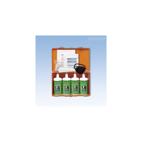 Kunststoffbox mit Wandhalterung. Enthält 4 gebrauchsfertige Druckspülflaschen mit Sterillösung je 250 ml + Sofortset für Augenverletzungen mit DuOcul-Augenkompressen, Augenklappe, SÖHNGEN®-Silk-Pflasterstreifen, DERMOTEKT®-Kompressen und Einmal-Schutzhandschuhen. Sterillösung für eine sofortige Spülung der Augen, des Bindehautsackes sowie betroffener Haut am Unfallort. Pufferlösung, bindet und neutralisiert, insbesondere auch nach Verätzungen durch Säuren oder Laugen sowie durch Pfefferspray, CS-Kampfgas oder Tränengas. Druckstrahl dosierbar, Fremdkörper können schonend ausgeschwemmt werden.