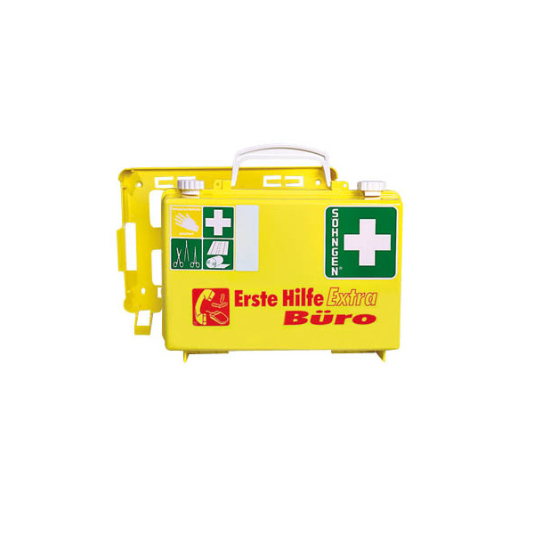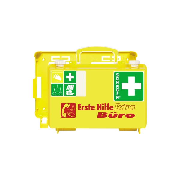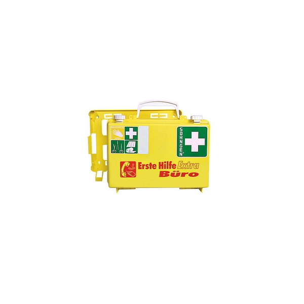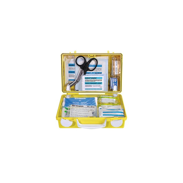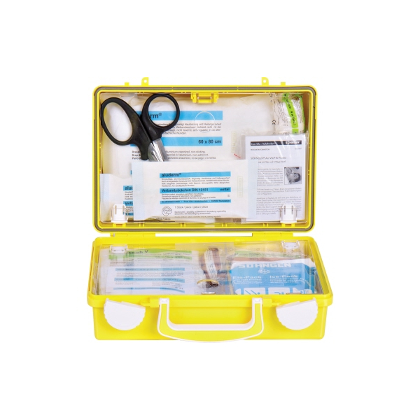 Erste Hilfe Koffer mit 1 x SÖHNGEN® Beatmungstuch BT-DRY 2 x PE-Druckverschlussbeutel 300 x 400 x 0,05 mm, 1 x SIRIUS® Rettungsdecke 210 x 160 cm, 1 x aluderm® Verbandtuch 60 x 80 cm, 6 x aluderm® Kompresse einzeln 10 x 10 cm, 2 x aluderm® Augenkompresse DuOcul, 1 x aluderm® Verbandpäckchen DIN klein, 3 x aluderm® Verbandpäckchen DIN mittel, 1 x aluderm® Verbandpäckchen DIN groß, 2 x WS-Fixierbinde 4 m x 6 cm, 2 x WS-Fixierbinde 4 m x 8 cm, 1 x Vliestücher 200 x 300 mm à 5 Stück, 2 x Medizinische Mundschutzmaske EN 14683-2019 IIR einzeln, 1 SÖHNGEN®-Pore 5 m x 2,50 cm, 1 x aluderm®-aluplast Sortiment klein, 1 x aluderm®-aluplast elastisch VBK-Set 12 Stück a 10 x 6 cm, 4 x Feuchttuch zur Reinigung unverletzter Haut einzeln, 2 x Dreiecktuch V SO RD, 1 x Handsc