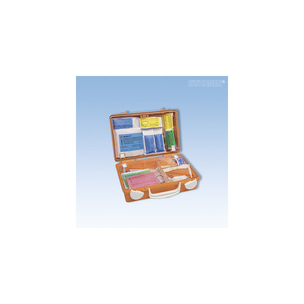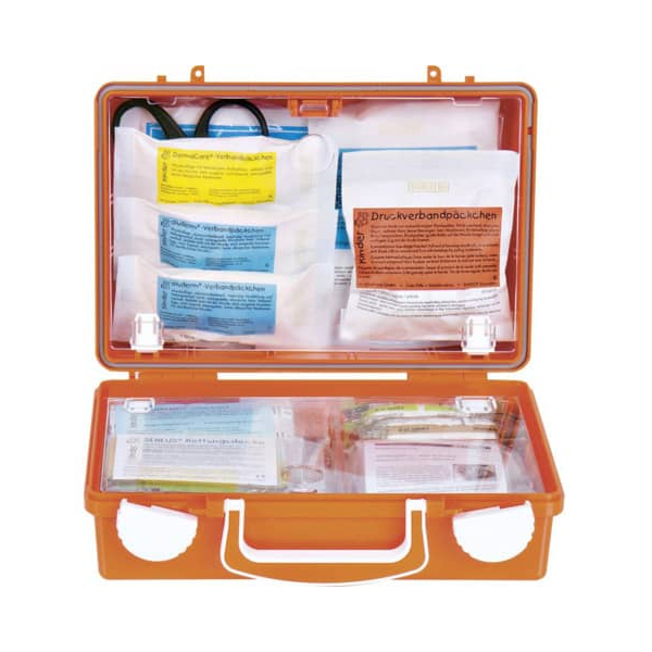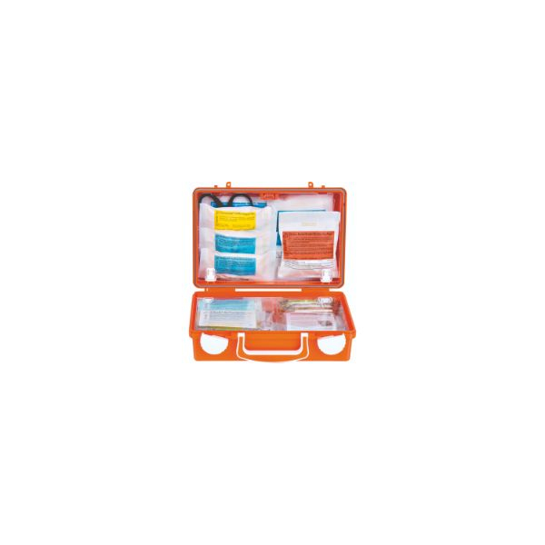 Erste Hilfe Koffer mit 1 x SÖHNGEN® Beatmungstuch BT-DRY 2 x PE-Druckverschlussbeutel 300 x 400 x 0,05 mm, 1 x SIRIUS® Rettungsdecke 210 x 160 cm, 1 x aluderm® Verbandtuch 60 x 80 cm, 6 x aluderm® Kompresse einzeln 10 x 10 cm, 2 x aluderm® Augenkompresse DuOcul, 1 x aluderm® Verbandpäckchen DIN klein, 3 x aluderm® Verbandpäckchen DIN mittel, 1 x aluderm® Verbandpäckchen DIN groß, 2 x WS-Fixierbinde 4 m x 6 cm, 2 x WS-Fixierbinde 4 m x 8 cm, 1 x Vliestücher 200 x 300 mm à 5 Stück, 2 x Medizinische Mundschutzmaske EN 14683-2019 IIR einzeln, 1 SÖHNGEN®-Pore 5 m x 2,50 cm, 1 x aluderm®-aluplast Sortiment klein, 1 x aluderm®-aluplast elastisch VBK-Set 12 Stück a 10 x 6 cm, 4 x Feuchttuch zur Reinigung unverletzter Haut einzeln, 2 x Dreiecktuch V SO RD, 1 x Handsc