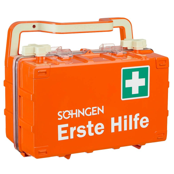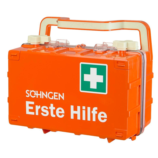 Erste Hilfe Koffer mit 1 x SÖHNGEN® Beatmungstuch BT-DRY, 2 x PE-Druckverschlussbeutel 300 x 400 x 0,05 mm, 1 x SIRIUS® Rettungsdecke 210 x 160 cm, 1 x aluderm® Verbandtuch 60 x 80 cm, 6 x aluderm® Kompresse einzeln 10 x 10 cm, 2 x aluderm® Augenkompresse DuOcul, 1 x aluderm® Verbandpäckchen DIN klein, 3 x aluderm® Verbandpäckchen DIN mittel, 1 x aluderm® Verbandpäckchen DIN groß, 2 x WS-Fixierbinde 4 m x 6 cm, 2 x WS-Fixierbinde 4 m x 8 cm, 1 x Vliestücher 200 x 300 mm à 5 Stück, 2 x Medizinische Mundschutzmaske EN 14683-2019 IIR einzeln, 1 x SÖHNGEN®-Pore 5 m x 2,50 cm, 1 x aluderm®-aluplast Sortiment klein, 1 x aluderm®-aluplast elastisch VBK-Set 12 Stück a 10 x 6 cm, 4 x Feuchttuch zur Reinigung unverletzter Haut einzeln, 2 x Dreiecktuch V SO RD, 1 x Ha