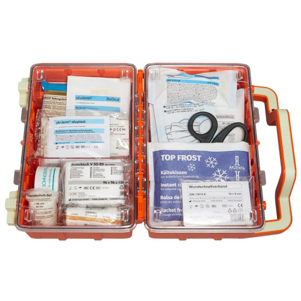 Erste Hilfe Koffer mit 1 x SÖHNGEN® Beatmungstuch BT-DRY, 4 x PE-Druckverschlussbeutel 300 x 400 x 0,05 mm, 2 x SIRIUS® Rettungsdecke 210 x 160 cm, 1 x DermaCare® Verbandpäckchen DIN klein, 3 x DermaCare® Verbandpäckchen DIN mittel, 1 x DermaCare® Verbandpäckchen DIN groß, 1 x Verbandtuch DIN SO 60 x 80 cm, 1 x aluderm® Verbandtuch 60 x 80 cm, 6 x aluderm® Kompresse einzeln 10 x 10 cm, 4 x aluderm® Augenkompresse DuOcul, 1 x aluderm® Verbandpäckchen DIN klein, 3 x aluderm® Verbandpäckchen DIN mittel, 1 x aluderm® Verbandpäckchen DIN groß, 6 x DERMOTEKT® Kompresse V 10 x 10 cm einzeln, 4 x WS-Fixierbinde 4 m x 6 cm, 4 x WS-Fixierbinde 4 m x 8 cm, 2 x Vliestücher 200 x 300 mm à 5 Stück, 4 x Medizinische Mundschutzmaske EN 14683-2019 IIR einzeln, 2 x SÖHNGEN®-P