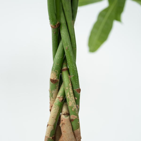 Die Pachira ist eine echte tropische Pflanze, die ursprünglich aus den Sümpfen von Ostbrasilien, Panama und Costa Rica stammt, wo sie bis zu 20 Meter hoch wird. Für Menschen, die ihre Pflanzen manchmal vergessen, ist die Pachira ideal, da sie keine großen Ansprüche stellt. Und der geflochtene Stiel verleiht der Pachira einen ganz besonderen Look! Die Pachira mag einen hellen Standort und nicht zu nah am Fenster. Da sie Wasser in ihrem Stamm speichert, muss der Boden trocken sein, bevor er erneut gegossen wird. Im Winter wird die Pflanze gerne gegossen, das beugt Blattverlust vor und regt die Bildung neuer Blätter an. Alte Blätter können ruhig herausgeschnitten werden. Im Sommer muss die Pflanze etwa zweimal pro Woche gegossen werden.