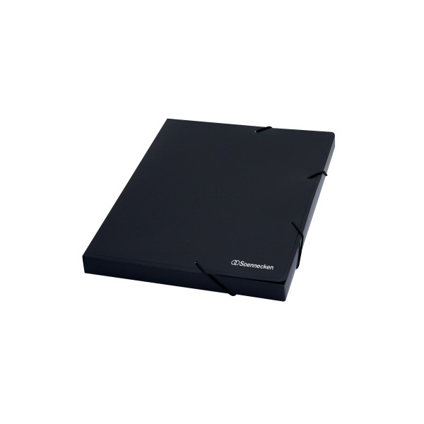 Soennecken 1651 Heftbox • Format: DIN A4 • Farbe: schwarz • Füllhöhe: 2,5cm • Fassungsvermögen ca.: 250 Blatt • Verschlussart: 2 Gummizüge (Eckspanngummis) • Material: Polypropylen (PP) 80 g/m² • 1 x Loseblatt-Ablage • Rückenschild: ohne Rückenschild