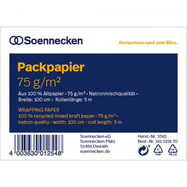 Entdecken Sie die hochwertige Packpapierrolle 3561 in der Farbe braun, hergestellt von Soennecken. Diese Packpapierrolle bietet Ihnen eine zuverlässige und umweltfreundliche Lösung für Ihre Verpackungsbedürfnisse. Mit einer Breite von 100 cm und einer Länge von 5 m ist dieses robuste Verpackungsmaterial ideal für unterschiedlichste Anwendungen.