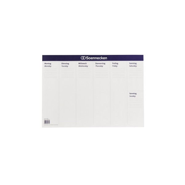 Entdecken Sie die elegante Schreibunterlage 3666 in einem ansprechenden weiß-blauen Design, gefertigt vom renommierten Hersteller Soennecken. Diese praktische Unterlage misst 58,9x41,9 cm und bietet Ihnen nicht nur eine stilvolle Schreibfläche, sondern auch eine durchdachte Organisation für Ihre Wochenplanung.