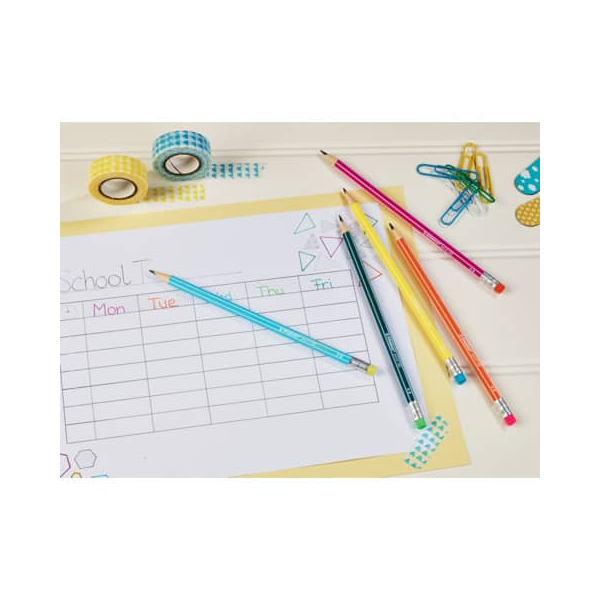 Der Bleistift ist aus Holz gefertigt und kommt in knalligen Schaftfarben, die gute Laune beim Schreiben verbreiten. Der Radierer am Ende des Bleistifts ist in einer angesagten Kontrastfarbe gehalten und sorgt dafür, dass Sie auch kleine Fehler mühelos korrigieren können.