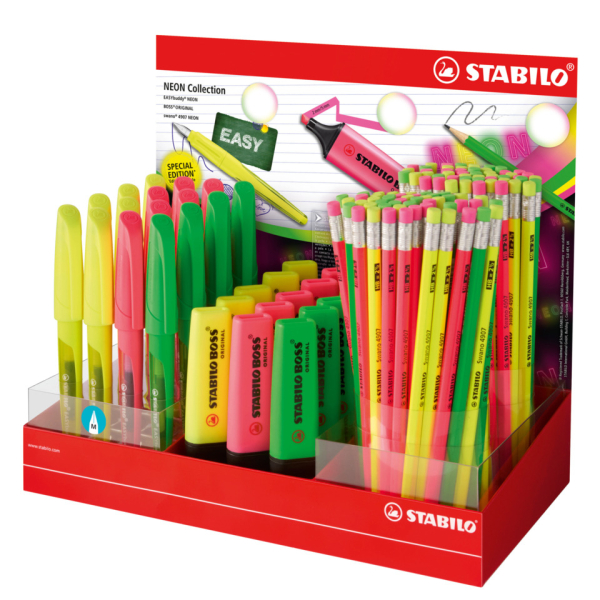 131 Stifte in leuchtenden Neonfarben, sortiert in 3 Versionen: 16 ST STABILO EASYbuddy NEON (Schulfüller), sortiert in 3 Farben: 4 ST 5031/18-41, je 6 ST 5031/16-41, 5031/17-41, 15 ST STABILO BOSS ORIGINAL (Textmarker), sortiert in 3 Farben: je 5 ST 70/24, 33, 56, 100 ST STABILO Swano (Bleistift mit Radierer), sortiert in 3 Farben: je 30 ST 4907/HB-33, 4907/HB-56, 40 ST 4907/HB-24