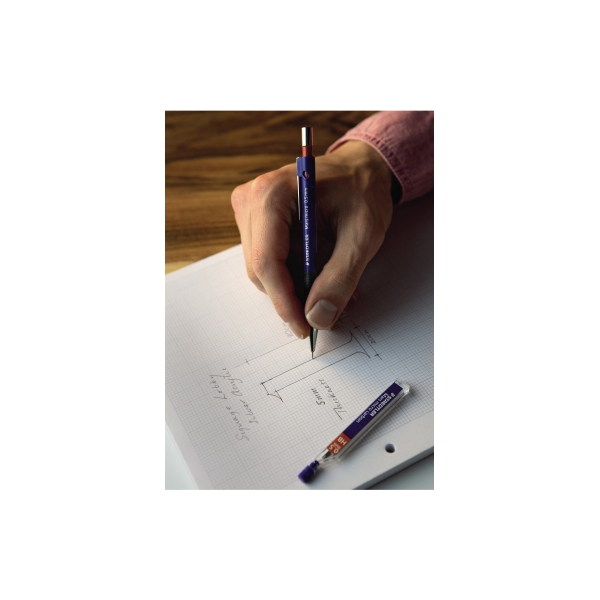 Der Druckbleistift ist mit einer rutschfesten Kautschukgriffzone ausgestattet, die einen komfortablen Halt garantiert. Dank des Clips und der Druckmechanik ist er nicht nur praktisch, sondern auch taschensicher – das versenkbare Metall-Minenröhrchen schützt die Spitze zuverlässig. Das zylindrische Minenröhrchen ist ideal für den Einsatz mit Linealen und Schablonen.