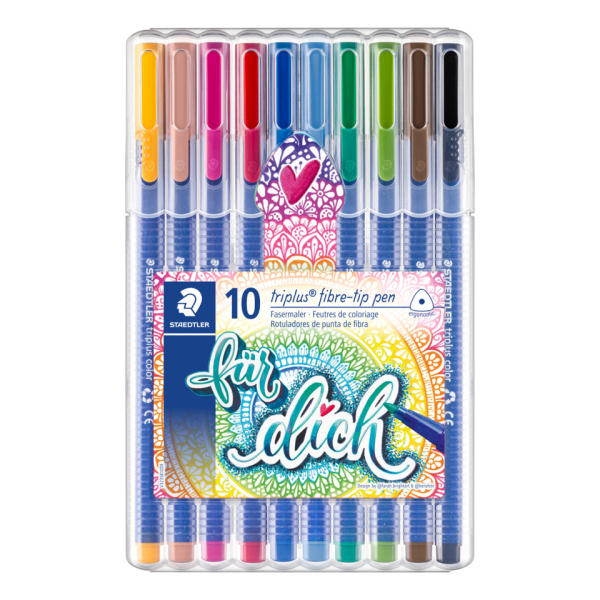 Fasermaler triplus® color Dreikantiger Fasermaler. Tinte auf Wasserbasis, Leicht auswaschbar aus den meisten Textilien, PP-Schaft garantiert lange Lebensdauer, Linienbreite ca. 1,0 mm, Mix & Match Eigenschaft in Kombination mit dem Modell 334, Gehäuse aus 97% recyceltem Plastik, Fasermaler mit ergonomischem Dreikantschaft für entspanntes Schreiben und Malen, Stabile, eindrucksichere Spitze, Kappe mit Atemluftkanal nach ISO 11540 und BS 7272-1/2, DRY SAFE - kann tagelang offen liegen ohne einzutrocknen. Ausführung Schreibflüssigkeit: Tinte auf Wasserbasis, Schreibfarbe von Schreibgeräten: 10 Farben: 1 gelb, 2 rot, 20 magenta, 3 blau, 30 lichtblau, 4 orange, 5 grün, 50 gelbgrün, 76 van-Dyke-braun, 9 schwarz, auswaschbar, brillante Farben, kann einige Tage offen liegen bleiben ohne einzutrocknen. Ausführung Schreibspitze: Ausführung der Spitze: Faserspitze (Rund), Strichstärke: ca. 1,0 mm, Spitze druckgesichert. Ausführung Schaft: Farbe des Schaftes: blau, Clip vorhanden. Material des Schaftes: 97% recyceltem Plastik. Ausführung des Inhalts mit Packung: aufstellbare STAEDTLER Box mit 10 Farben, Zertifikat/Zulassung: EN71