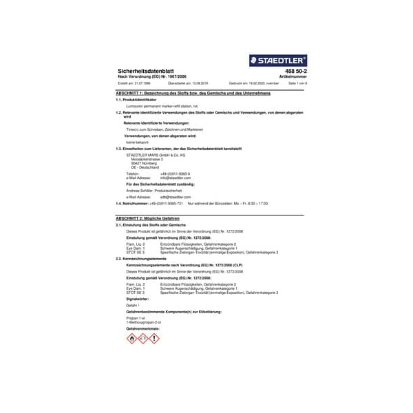 STAEDTLER MARS GmbH & Co. KG, Moosäckerstrasse 3, 90427 Nürnberg, DE – Deutschland , Telefon: +49-(0)911-9365-0, E-Mail Adresse: info@staedtler.com | Für das Sicherheitsdatenblatt zuständig: Andreas Schäfer, Produktsicherheit E-Mail Adresse: sdb@staedtler.com
