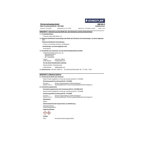 STAEDTLER MARS GmbH & Co. KG, Moosäckerstrasse 3, 90427 Nürnberg, DE – Deutschland , Telefon: +49-(0)911-9365-0, E-Mail Adresse: info@staedtler.com | Für das Sicherheitsdatenblatt zuständig: Andreas Schäfer, Produktsicherheit E-Mail Adresse: sdb@staedtler.com