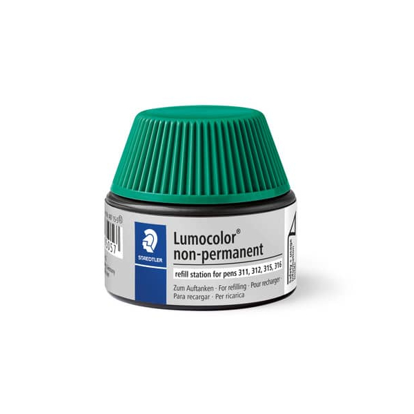 Entdecken Sie die praktische Tintentank f.OHPStift wasserl. grün Lumocol. non-permanent von Staedtler, die ideale Lösung zum Nachfüllen Ihres Lumocolor Stiftes. Diese Nachfülltinte Boardmarker ermöglicht es Ihnen, Ihre Stifte einfach und umweltfreundlich wieder aufzufüllen. Die innovative Tankstelle aus PP sorgt dafür, dass Ihr Stift nach wenigen Minuten wieder schreibbereit ist. Innerhalb von 3 bis 4 Stunden ist der Stift vollständig gefüllt, und ein Überfüllen ist nicht möglich – die maximale Tintenmenge wird automatisch entnommen.