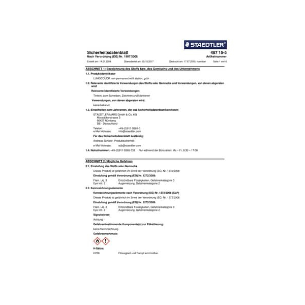 STAEDTLER MARS GmbH & Co. KG, Moosäckerstrasse 3, 90427 Nürnberg, DE – Deutschland , Telefon: +49-(0)911-9365-0, E-Mail Adresse: info@staedtler.com | Für das Sicherheitsdatenblatt zuständig: Andreas Schäfer, Produktsicherheit E-Mail Adresse: sdb@staedtler.com