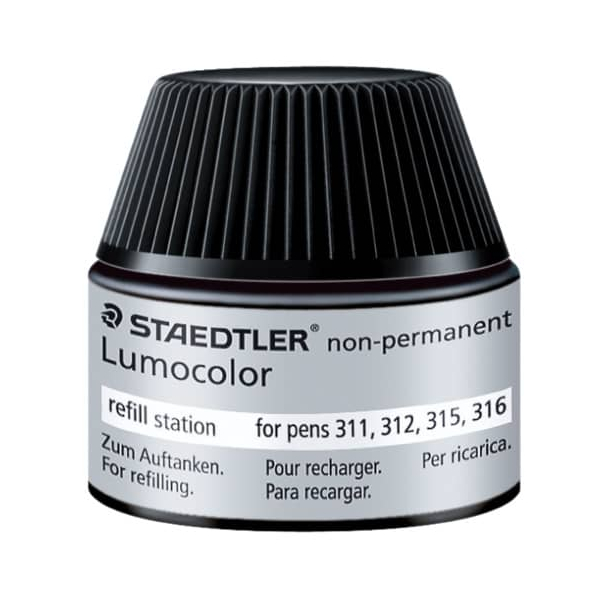 Entdecken Sie die praktische Nachfülltinte Boardmarker von Staedtler, ideal geeignet für Ihre Lumocolor non-permanent Universalstifte! Mit der Lumocolor refill station für Lumocolor non-permanent Universalstifte erhalten Sie eine hochwertige Tinte, die einfach und sauber nachgefüllt werden kann.