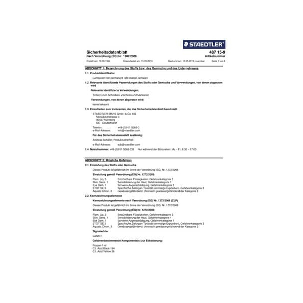 STAEDTLER MARS GmbH & Co. KG, Moosäckerstrasse 3, 90427 Nürnberg, DE – Deutschland , Telefon: +49-(0)911-9365-0, E-Mail Adresse: info@staedtler.com | Für das Sicherheitsdatenblatt zuständig: Andreas Schäfer, Produktsicherheit E-Mail Adresse: sdb@staedtler.com