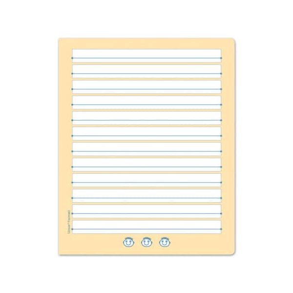 für Druckschrift und Vereinfachte Ausgangsschrift, für Links- und Rechtshänder, farbig hinterlegte Lineatur mit gelbem Mittelband und Schreiblernhäusern, neu: runde Ecken verhindern "Eselsohren"