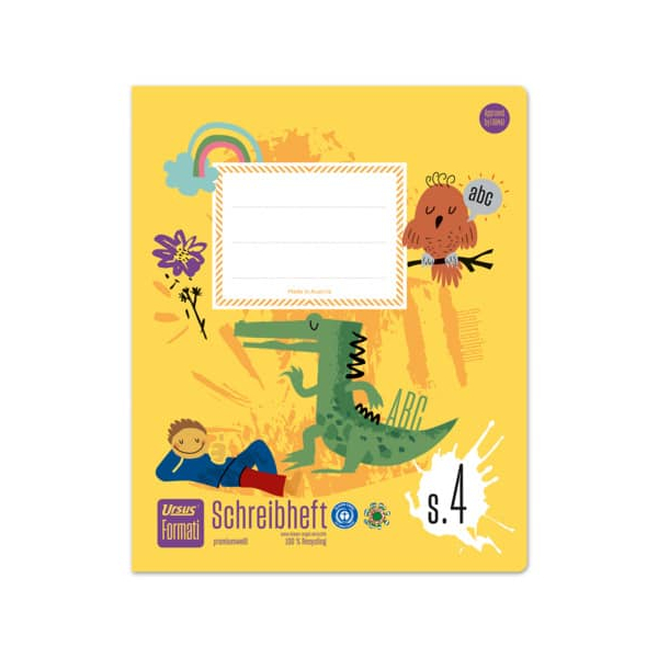 für Druckschrift und Vereinfachte Ausgangsschrift, für Links- und Rechtshänder, farbig hinterlegte Lineatur mit gelbem Mittelband und Schreiblernhäusern, neu: runde Ecken verhindern "Eselsohren"