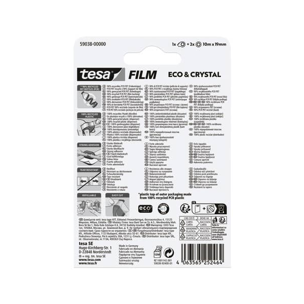 Entdecken Sie das hochwertige Klebeband von Tesa: das Eco & Crystal Modell 59038-00000-00. Mit einer Breite von 19 mm und einer Länge von 10 m ist dieses klebende Wunder nicht nur stark, sondern auch umweltbewusst. Es besteht zu 90% aus recycelten PET-Flaschen und ist somit eine ausgezeichnete Wahl für alle, die nachhaltige Produkte schätzen.