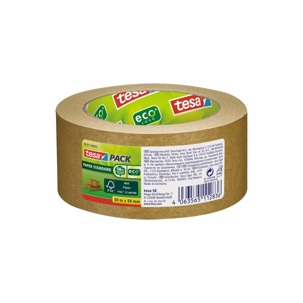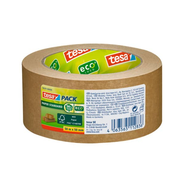 Entdecken Sie das Packband tesapack Paper Standard von Tesa, das nachhaltiges und umweltfreundliches Kleben und Paketepacken kinderleicht macht! Das Klebeband besteht zu 56 Prozent aus biobasiertem Material und haftet dank eines Klebstoffs aus Naturkautschuk besonders gut auf Karton. Es wird aus Papier hergestellt, das aus nachhaltiger Forstwirtschaft stammt.