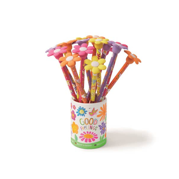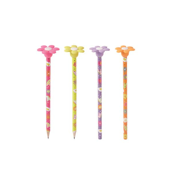 Das blumige Design mit Silberfolierung und der Radiertopper in Form einer Blüte machen diesen Bleistift zum idealen Begleiter für alle Blumen-Fans. Erhältlich in vier verschiedenen Neon-Farbdesigns – lila, pink, orange und gelb – bringt er Farbe in jeden Alltag.