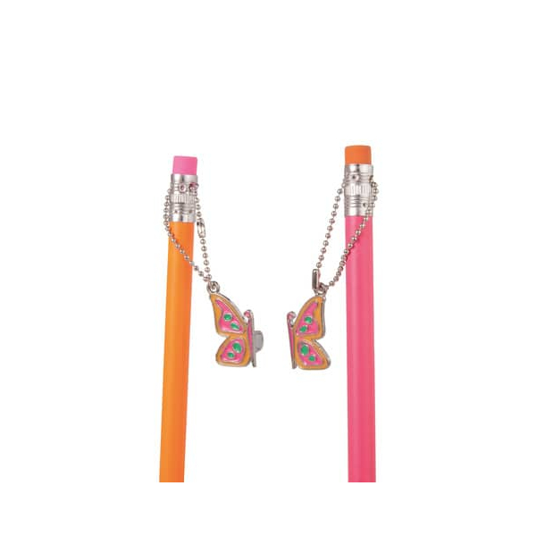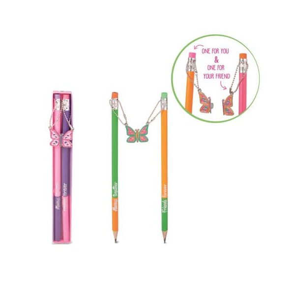 Entdecken Sie das Bleistift-Set Best Friends von Trendhaus, das nicht nur durch seine auffälligen Farben besticht, sondern auch durch seine kreative Funktionalität. Dieses neonfarbige Bleistift-Set ist magnetisch verbunden mit einem Schmetterlingsanhänger aus Metall, der abnehmbar und einzeln verwendbar ist. Jeder Stift kommt mit einem Silberfolien-Schriftzug sowie einem praktischen Radiertopper. Die Minenstärke ist HB, was sie perfekt für den Alltag macht.