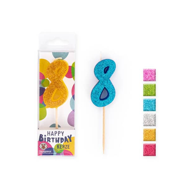 Verleihen Sie Ihrer Feier das besondere Etwas mit unserer Geburtstagskerze von Trendhaus. Die Mini Glitter Zahlenkerze in Form der Zahl 8 ist das perfekte Highlight für jede Geburtstagstorte oder Jubiläumsfeier. Mit ihrem glitzernden Design sorgt sie für funkelnde Momente und macht jeden Anlass unvergesslich!