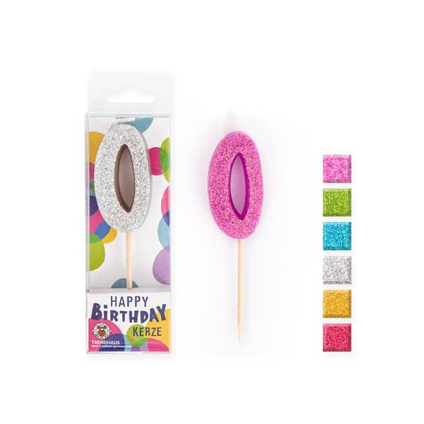 Trendhaus Geburtstagskerze Mini Glitter 957702 Zahl 0 Pink/Lila/Blau/Grün/Gelb und Silber