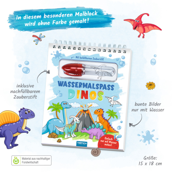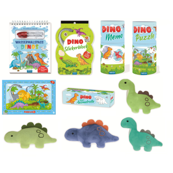 Das Thekendisplay Dino 37 teilig enthält 10 verschiedene Titel. Enthalten sind zwei Memo-Sets Dinosaurier mit je 6 × 13 cm großen Karten, insgesamt 30 Memokarten. Zusätzlich gibt es sechs Mini-Ausmalrollen Dino, die ausgerollt eine Länge von ca. 1 m erreichen. Im Set sind auch zwei Dinosaurier-Puzzles enthalten, jeweils 6 × 13 cm groß mit insgesamt 24 Puzzleteilen. Für kuscheligen Spielspaß sorgen vier Plüsch-Dinos: zwei in 18 cm (grün und blau) und zwei in 14 cm (grün und türkis). Außerdem enthält das Display fünf Rahmenpuzzles Dinos in der Größe 19 × 30 cm, jeweils 15-teilig. Kreativspaß bieten sechs Wassermalspaß-Bücher DINOS mit je 12 Seiten und einem Wasserstift. Für Stickerfans gibt es 12 Stickerblöcke Dinosaurier, jeweils 16 × 24 cm groß mit 4 Stickerseiten. Dieses Set bietet eine abwechslungsreiche Mischung aus Spielen, Rätseln, Malen und Basteln und ist perfekt für kleine Dino-Fans.