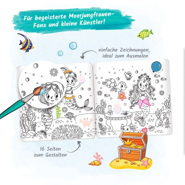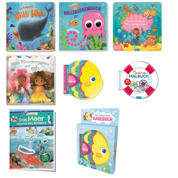 Das 25-teilige Display „Meereswelt“ bietet eine abwechslungsreiche Mischung an Büchern und Beschäftigungsideen rund um die faszinierende Unterwasserwelt. Enthalten sind vier Stickerbücher „Das Meer“ im Format 23 × 31 cm mit 32 Seiten sowie zwei zusätzlichen Stickerseiten. Dazu kommen zwei Exemplare von „Ein Freund für Willi Wal“ und zwei Bücher „Mila Meerjungfrau und ich“, jeweils im quadratischen 24 × 24 cm-Format mit 24 Seiten. Außerdem enthält das Display fünf Stickermalbücher „Meerjungfrauen“ (21 × 21 cm, 16 Seiten, inklusive zwei Stickerseiten), drei Kulleraugenbücher „Meerestiere“ (19 × 19 cm, 10 Seiten) sowie drei wassersichere Badebücher „Mein kleiner Fisch“ (15 × 15 cm, 8 Seiten). Abgerundet wird die Auswahl durch drei maritime Malbücher im Format 16 × 15 cm mit 80 Seiten und drei Rasselbücher „Mein kleiner Fisch“ im Format 14 × 14 cm mit 10 Seiten. Dieses bunte Display lädt Kinder zum Entdecken, Lesen und kreativen Gestalten in der Welt der Meere ein.