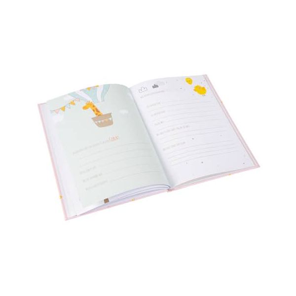 Das Babytagebuch im Format 21x28 cm ist ein toller Begleiter für die ersten Tage, Wochen und Monate im Leben. Hier können die frischgebackenen Eltern wichtige Daten, Tage und Ereignisse ganz einfach und schnell eintragen und verewigen. Auf rund 44 illustrierten Seiten können z. B. Augenfarbe, Größe, Gewicht bei der Geburt, besondere Ereignisse an dem Tag und natürlich auch die wichtigen Bezugspersonen wie Großeltern, Pate/Patin eingetragen werden.