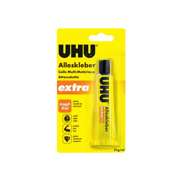UHU Alleskleber 46010 extra, 20g, permanent | UHU Alleskleber 45020 Original, 35g, permanent | UHU Alleskleber 46015 extra, 31g, permanent | UHU Alleskleber 46050 extra, 125g, permanent | UHU Alleskleber 46405 Original, 20g, permanent | UHU Alleskleber 48490 extra FLEX + CLEAN, 18g, permanent | UHU Alleskleber 48495 KRAFT FLEX, 18g, permanent | UHU Alleskleber 46480 Kontakt, 45g, permanent | UHU Alleskleber 45050 Original, 125g, permanent | UHU Alleskleber 45040 KRAFT, 42g, permanent |