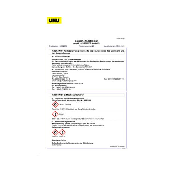 UHU GmbH & Co.KG, Herrmannstraße 7, D-77815 Bühl (Baden), Tel.:0049-(0)7223-284-0, Fax: 0049-(0)7223-284-245, email: sds@uhu.boltongroup.com