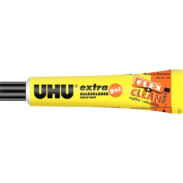 UHU Alleskleber extra 85 Alleskleber permanent. • Inhalt: 18g • Klebekraft: extra stark • Lösungsmittelfrei: nein • weiter Eigenschaften: tropffrei, wasserfest, gel