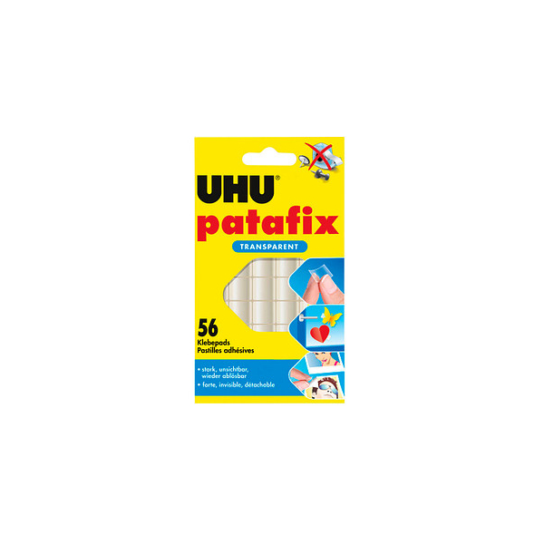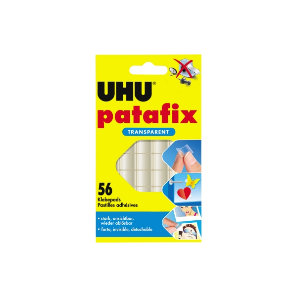 Die UHU® patafix TRANSPARENT sind ideale Klebepads/Klebestrips zum schnellen und sauberen Befestigen und Fixieren von kleineren Objekten auf verschiedenen Untergründen wie z. B. an Türen, Fenstern oder Möbelfronten. Diese patafix Klebepads sind absolut unsichtbar und können von den meisten glatten Untergründen wieder rückstandslos entfernt werden.