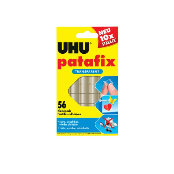 Die UHU® patafix TRANSPARENT sind nicht nur vielseitig einsetzbar, sondern auch dermatologisch getestet. Sie eignen sich perfekt zum Fixieren von Fotos, Postkarten, Postern und vielen weiteren Gegenständen. Die transparenten, doppelseitigen Klebepads sind unter transparenten Objekten und auf den meisten glatten Untergründen absolut unsichtbar.
