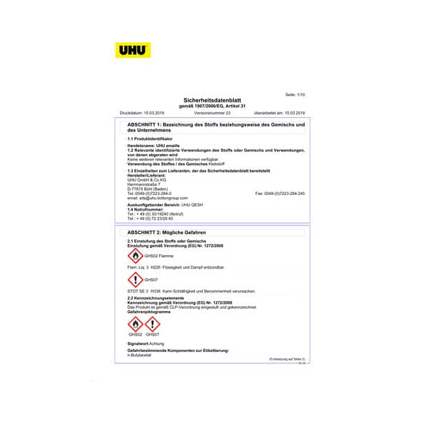 UHU GmbH & Co.KG, Herrmannstraße 7, D-77815 Bühl (Baden), Tel.:0049-(0)7223-284-0, Fax: 0049-(0)7223-284-245, email: sds@uhu.boltongroup.com