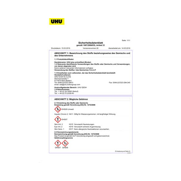 UHU GmbH & Co.KG, Herrmannstraße 7, D-77815 Bühl (Baden), Tel.:0049-(0)7223-284-0, Fax: 0049-(0)7223-284-245, email: sds@uhu.boltongroup.com