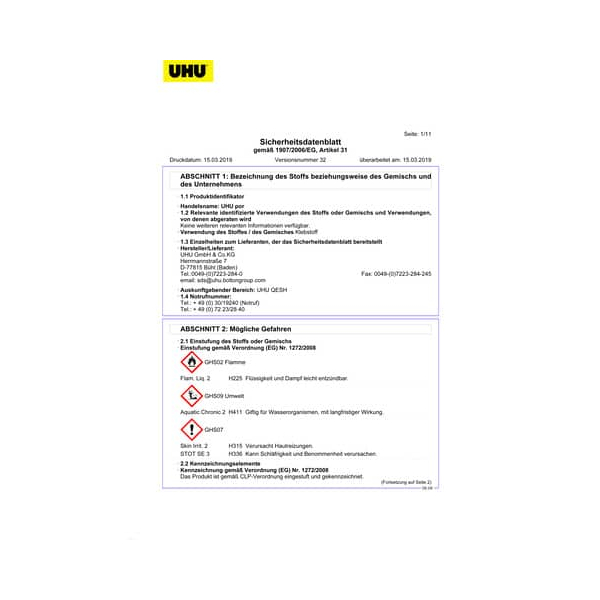 UHU GmbH & Co.KG, Herrmannstraße 7, D-77815 Bühl (Baden), Tel.:0049-(0)7223-284-0, Fax: 0049-(0)7223-284-245, email: sds@uhu.boltongroup.com
