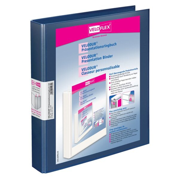 Veloflex VELODUR® 1143150 Präsentationsringbuch • Format: A4 • Ringanzahl: 2 Ringe mit Ring-Ø 25mm für 250 Blatt • Ringform: D-Ring • Ringmechanik: 2-D-Ring-Hebelmechanik • Rückenbreite: 40mm • Taschen: 2 Außentaschen • Material: Pappe/PP-Folie • Farbe: blau