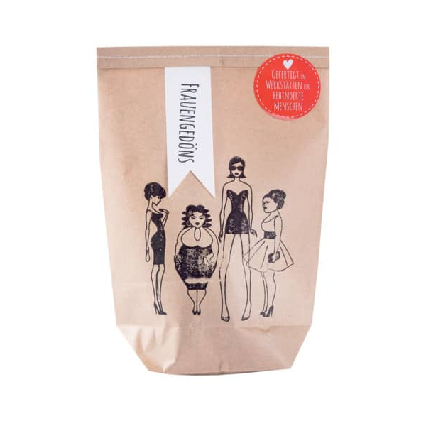 WUNDERLE präsentiert die bezaubernde Wundertüte Frauengedöns! Diese liebevoll gestaltete Überraschungstüte wird in Werkstätten für Menschen mit Behinderung von einzigartigen Menschen handgestempelt, befüllt und verschlossen. Durch diese Handanfertigung erhält jede Papiertüte ihre ganz persönliche Note, sodass jede einzelne eine eigene Handschrift trägt.
