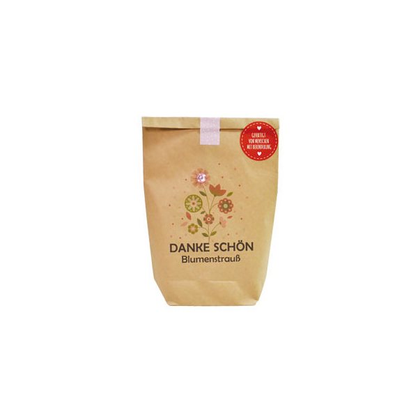1x Blumenstraußsamen zum Aussäen, Danke Schön Spruchkarte, Pflanzstecker aus Holz mit Holzblüten, ökologische Pflanztüte und Anzuchterde