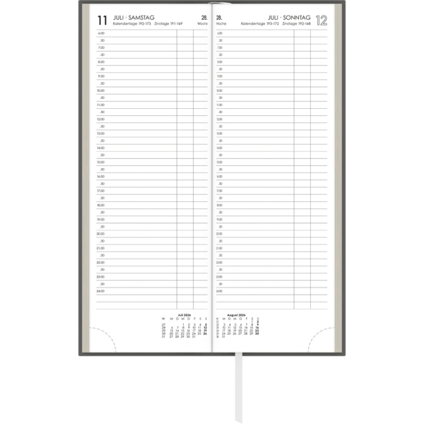 Die Halbstundeneinteilung von 6 bis 24 Uhr ermöglicht eine detaillierte Terminübersicht, die ideal für Beruf und Alltag ist. Sonn- und Feiertage sind farblich hervorgehoben, ebenso sind Tages- und Zinstage gekennzeichnet. Eine Wochenzählung, eine Zweimonatsübersicht sowie Steuertermine unterstützen zusätzlich bei der Organisation Ihrer Termine.