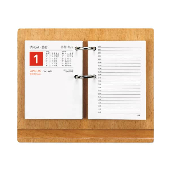 Der Kalenderholzuntersatz hat die Maße 24 x 18,5 cm und ist mit einer schrägstellbaren Funktion ausgestattet, die Ihnen eine optimale Sicht auf Ihren Kalender ermöglicht. Die zwei robusten Metallbügel mit einem Lochabstand von 38 mm sorgen für eine sichere Befestigung Ihres Kalenders und sind in der Höhe anpassbar.
