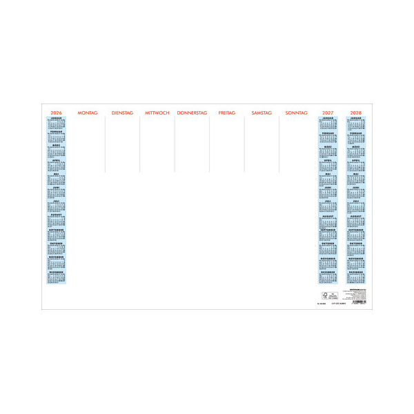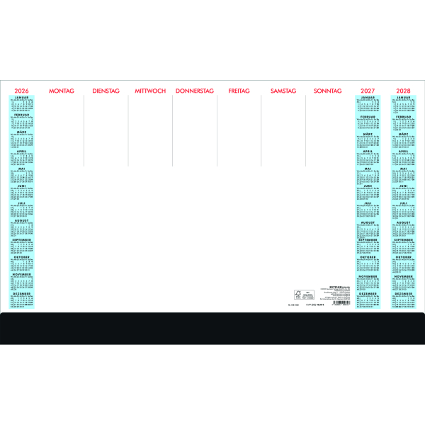 Die Unterlage bietet Ihnen nicht nur einen übersichtlichen Wochenplaner, sondern auch Jahresübersichten von 2026 bis 2027. Zusätzlich haben Sie reichlich Platz für Ihre täglichen Notizen. Um Eselsohren zu vermeiden, sorgt die stabile Schutzleiste am unteren Rand der Unterlage dafür, dass die Seiten immer gut aussehen.