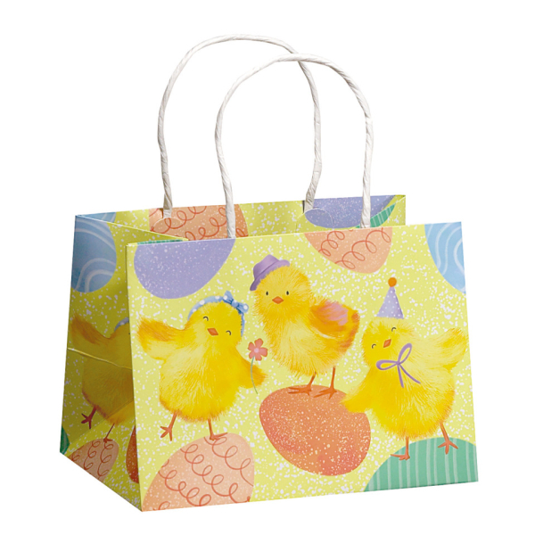 Fröhliche Geschenktragetasche mit lustigem Küken-Motiv. Gelb matt kaschiert, mit gedrehter Papierkordel. Die Maße von 13 x 18 x 12 cm bieten Platz für kleine Ostergeschenke und Überraschungen.